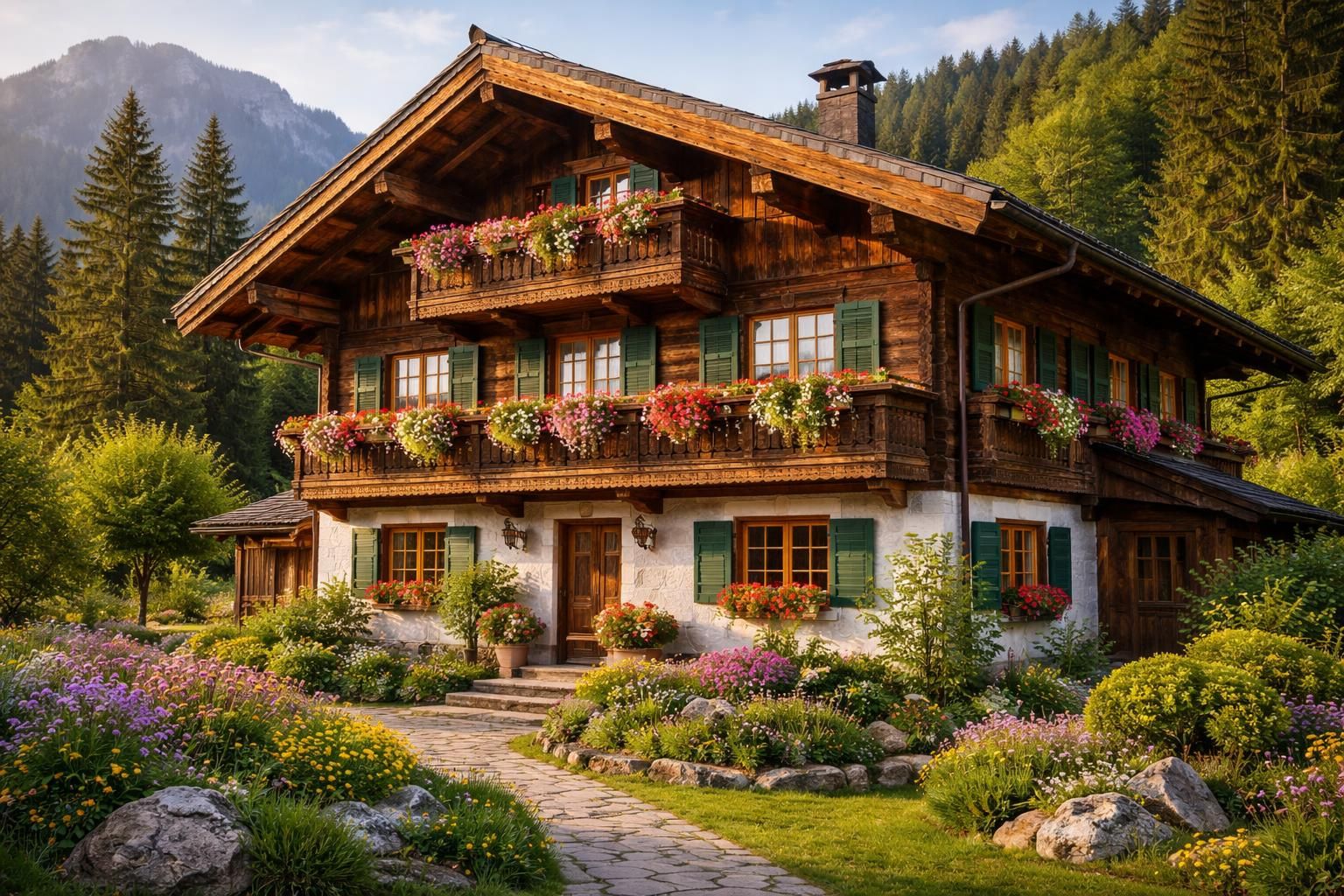 Les balcons en bois ajoutent une touche esthétique et fonctionnelle aux maisons. Souvent ornés de décorations alpines, ces balcons fournissent un espace extérieur pour profiter des paysages environnants. Ils sont généralement accessibles depuis le salon ou la chambre à coucher, offrant ainsi une transition entre l’intérieur et l’extérieur. Ces espaces sont souvent décorés avec des fleurs, insufflant une couleur vive à l’architecture boisée.